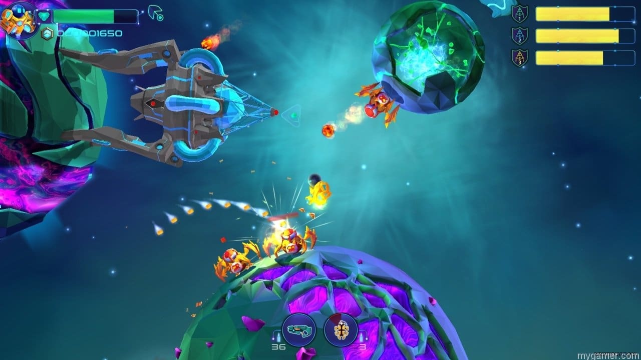 The action combines familiar arcade shooting gameplay with a unique possibility to switch gravity. Colorful graphics appeal to both younger and adult players while first-class music by Simon Viklund makes the adventure feel even more epic.